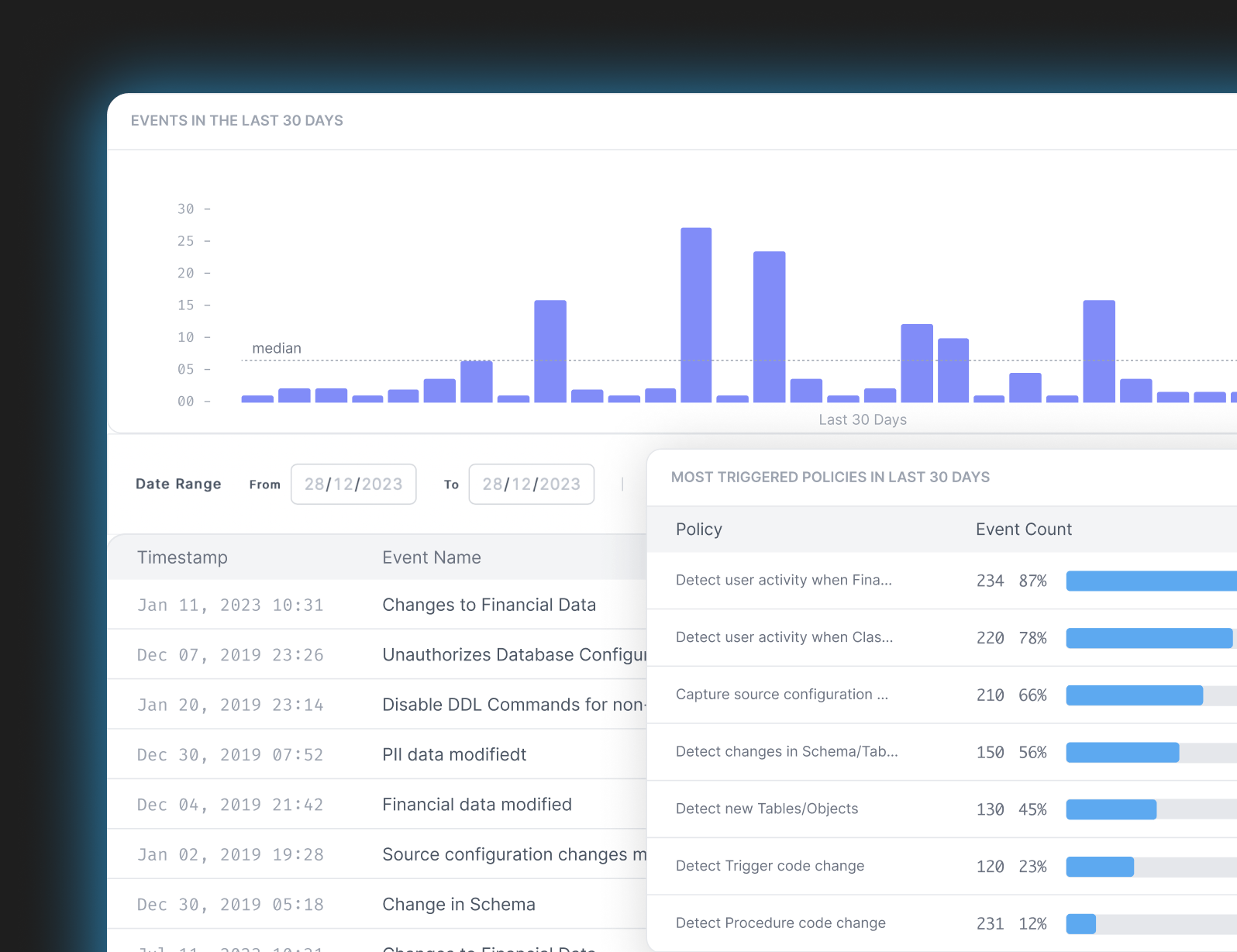 Set policies based on data classes and monitored events to proactively secure against unauthorized activity. Adaptive's predefined policies comply with GDPR, SOX, and RBI's new regulations around data privacy, helping you achieve compliance faster.